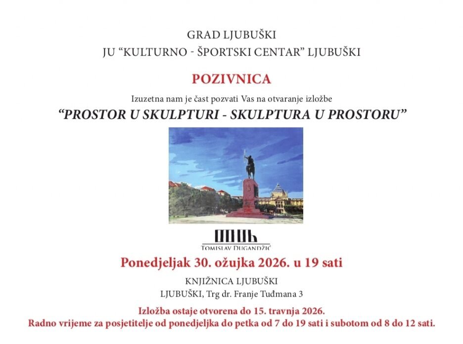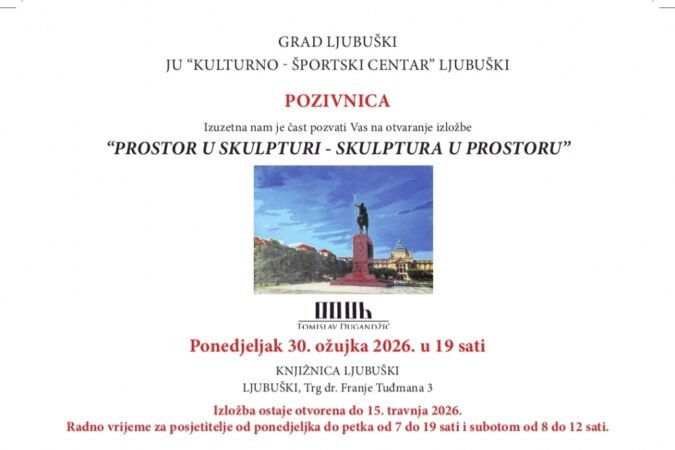 JU “Kulturno-športski centar” Ljubuški organizira izložbu skulptura pod nazivom “Prostor u skulpturi – skulptura u