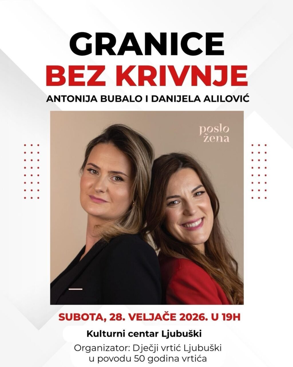 Predavanje organizira Dječji vrtić Ljubuški u sklopu obilježavanja 50 godina djelovanja vrtića, a namijenjeno je roditeljima, odgojiteljima te svima koji žele raditi na osobnom razvoju i unaprijediti svoje odnose.
