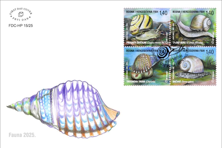 Magdalena Džinić Hrkać autorica je izdanja „Fauna 2025.“ koje sadrži četiri marke s motivima morskih i kopnenih puževa. Tritonova truba i puž bačvaš najveći su puževi u Jadranskom moru i spadaju u rijetke i zaštićene vrste. Ime tritonove trube veže se uz grčkog boga Tritona, sina boga mora Posejdona, koji je pušući u školjku kao u trubu uzdizao i smirivao valove. Puž bačvaš ima jednu rijetku karakteristiku – mogućnost luminescencije jer, kada se kreće vodom s potpuno raširenim stopalom, svijetli zelenkastom bojom. Vinogradnjak je jedan od najvećih kopnenih puževa., a prugasti živičnjak jedan je od najčešćih kopnenih puževa u Europi.